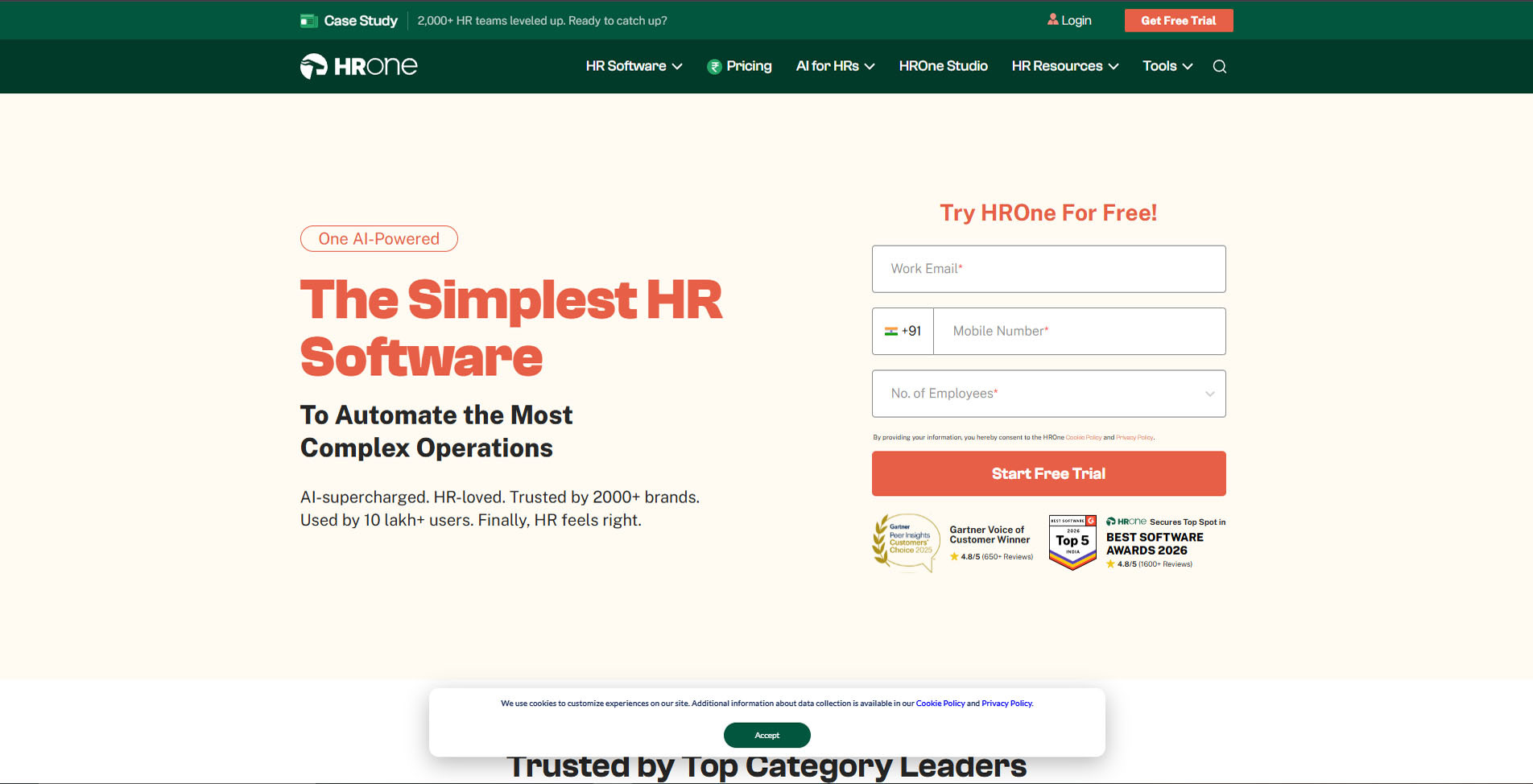 HROne offers AI-powered attendance and time tracking within a complete HR suite, gaining strong traction among Indian companies for its modern geo-fencing and mobile capabilities in 2026.Key features include GPS/selfie-based attendance, shift scheduling, leave integration, payroll synchronization, and insightful analytics dashboards.Pricing generally starts around ₹4,950/month for base plans (e.g., 50 users) with per-user scaling.It aligns well with Indian requirements through its mobile-first design and built-in compliance elements.
